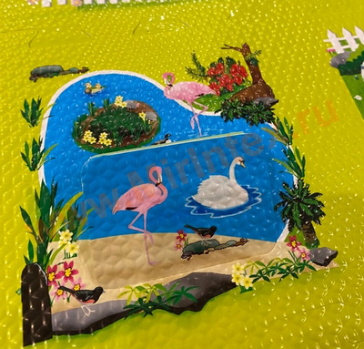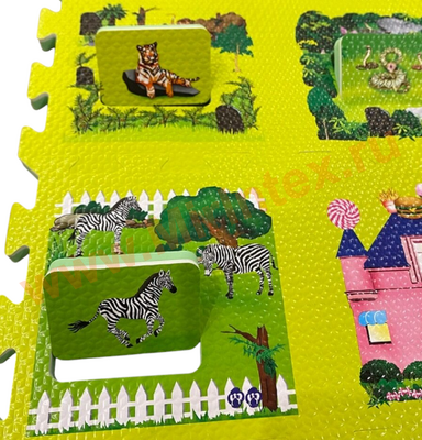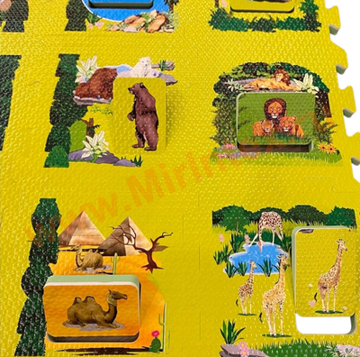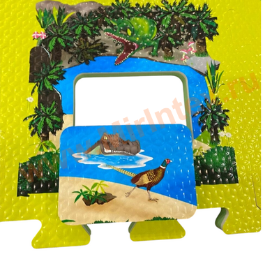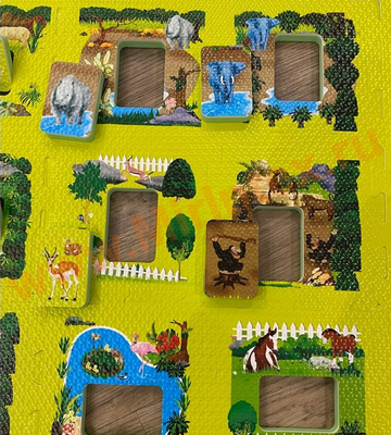 Дизайн коврика выполнен в стиле мини-зоопарк с вырубными картинками животных зверей и птиц.
