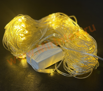 На одном конце электро - гирлянды находится сетевая вилка 220В, на другом коннектор для соединения с аналогичными гирляндами в одну цепочку, соединить можно до 4 шт., одновременно.
