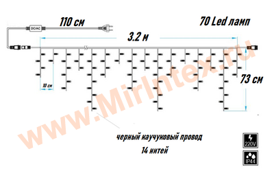 Гирлянда бахрома светодиодная 3 м, Led лампочки 70 шт., новогодняя бахрома украсит помещение как внутри, так и снаружи.