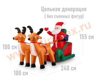 Несъемные фигуры: сани: 115х60х70см, олени: 110х90х100см, дед мороз: 100х80х35см, подарки: 50х40х25см