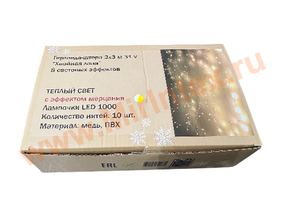 Гирлянда штора выполнена в виде основного шнура, с которого свисают нити с расположенными на них 1000 светодиодами.