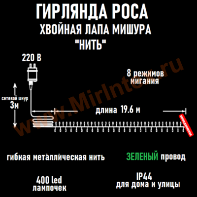 Новогодняя Уличная гирлянда Роса мишура хвойная лапа 19.6 метров - это светодиодная нить, которая подойдет для украшения окна, дома, офиса, квартиры, витрины магазина.