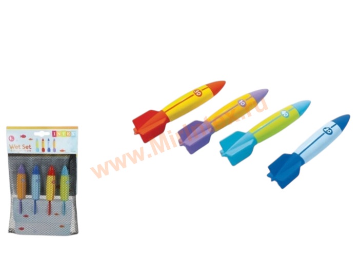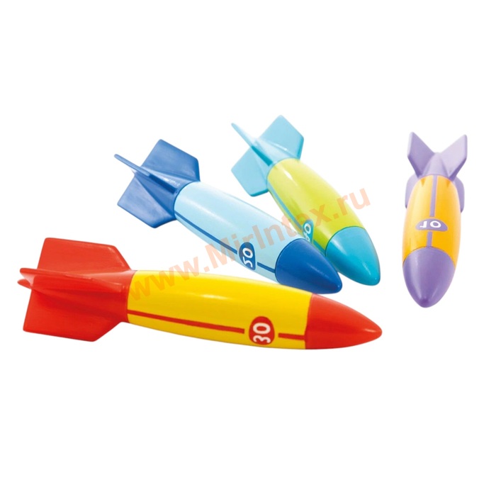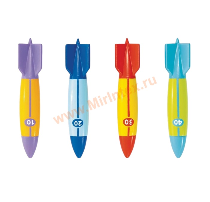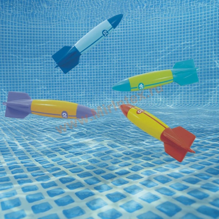 Торпеды для игры в бассейне Intex 55508 - в наборе 4 игрушки разного цвета. При наполнении игрушка начинает погружаться в воду, задача детей ныряя собрать как можно больше ракет.